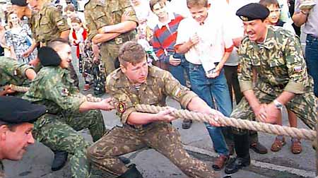 начать перетягивание каната. Естественно, эта стихийная забава проводилась под команды неиграющих тренеров (отцов-командиров). Какой-то дедок всё врем сокрушался: "Вы уж канат не порвите!" |