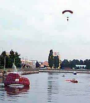 А это финальный номер празника приводнение парашютистов в Прегель. Шлепанье ласт парашютистов над головой - самое яркое воспоминание от этого дня. Пожилой рыбак, наблюдая за четверкой парашютистов, только что сброшенных с самолёта, прищурившись заметил: - Первого для прицела